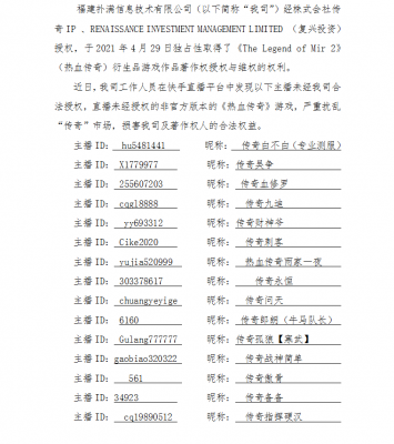 202106-07k1体育信息技术有限公司(以下简称“我司”)于2021年4月取得《传奇》游戏在中国大陆地区的独占性授权。自被授权以来,我司一直积极响应国家知识产权保护政策,始终...